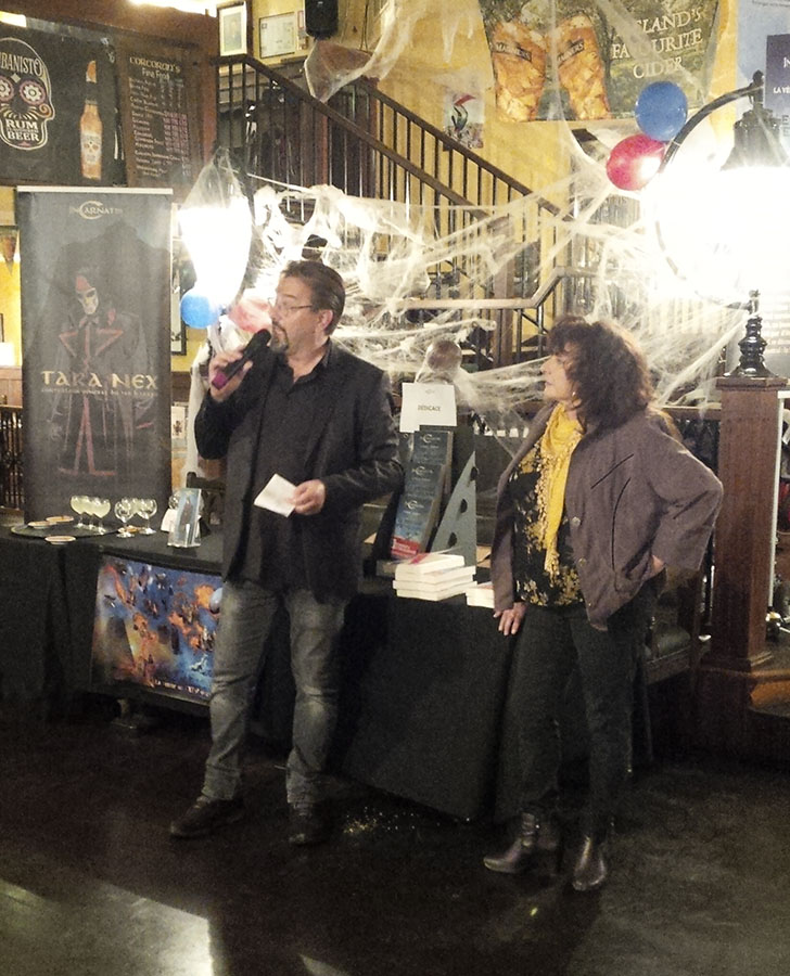 A cette soirée de lancement, la salle du bar était décorée pour l’occasion, et quelques cosplayers, représentant des personnages issus de l’univers du livre, étaient aussi présents. Marc Frachet a présenté l’univers d’InCarnatis, (dont nous parlerons plus en détail dans une chronique du livre très bientôt sur Le Mont des Rêves), en présence d’Odile Schmitt, qui en a profité pour nous lire un extrait de récit audio du premier tome. Une séance de dédicaces était ensuite organisée.
