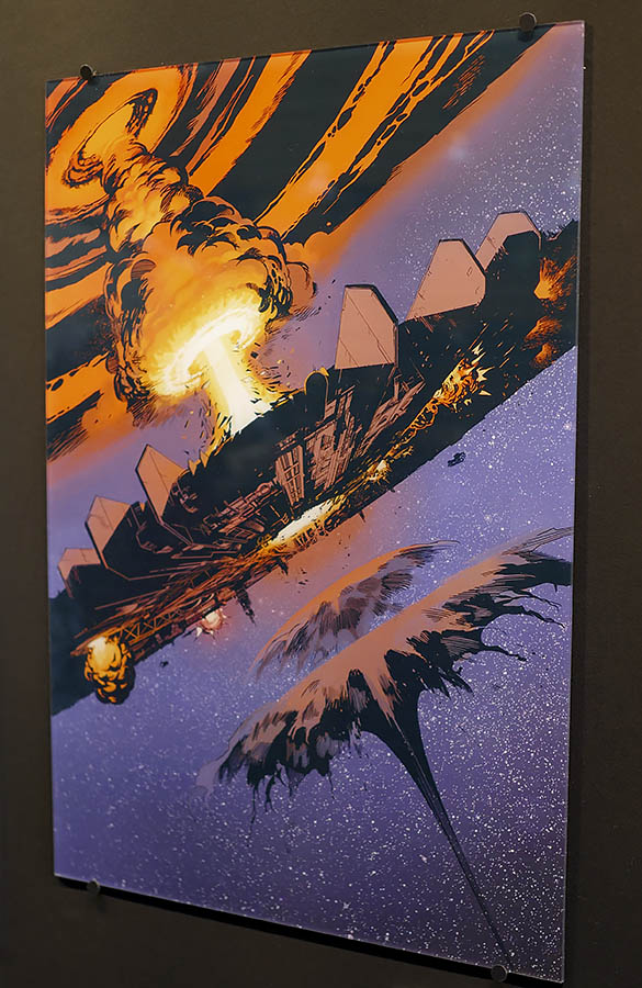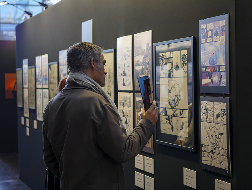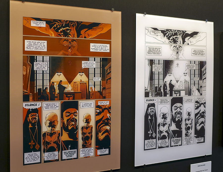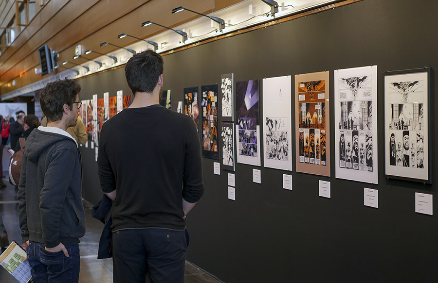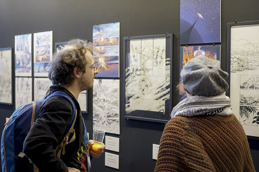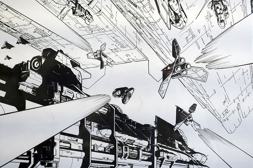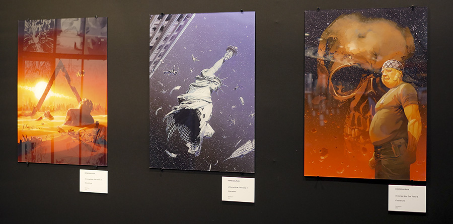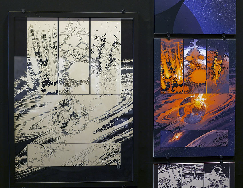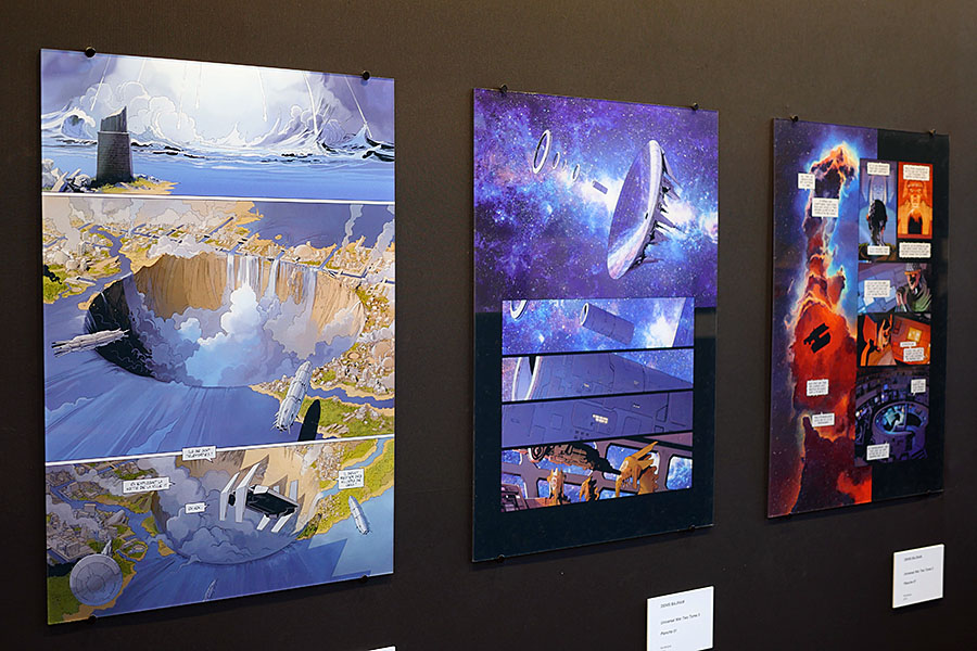 On revient un peu sur l’expo consacrée à Denis Bajram, connu pour sa saga en BD Universal War One et sa suite Universal War Two. Des storyboards, croquis et mises en couleur de nombreuses planches étaient visibles, dont voici un tout petit échantillon :