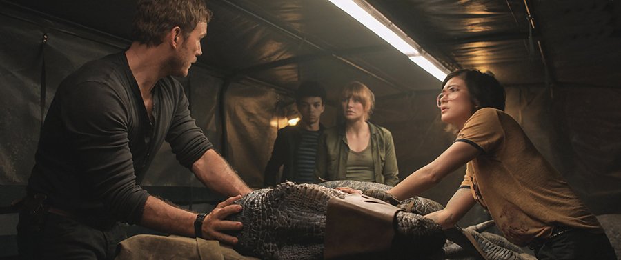 Après une intro présentant la nouvelle vie de Claire suite au fiasco de Jurassic World (Elle a au passage complètement changé de personnalité, passant de directrice du parc sans empathie à défenseuse de la cause des dinosaures…), l’équipe mandatée par Lockwood, et composée notamment d’Owen, Claire, Franklin – analyste – et Zia – paléovétérinaire – arrive sur Isla Nublar pour sauver des dinosaures, et particulièrement Blue, le raptor domestiqué d’Owen.
